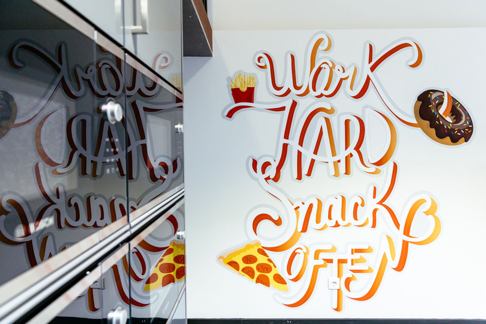 If you go straight ahead, after some illustrations full of life and color embedded in the walls, you can find the rest and leisure areas, because it’s important to “Work Hard, Snack Often!”. The cafeteria is located side-by-side with a game area: a darts game or a PlayStation match can improve the day for many. Or the other way around! In the end, what matters is to participate, isn’t it?